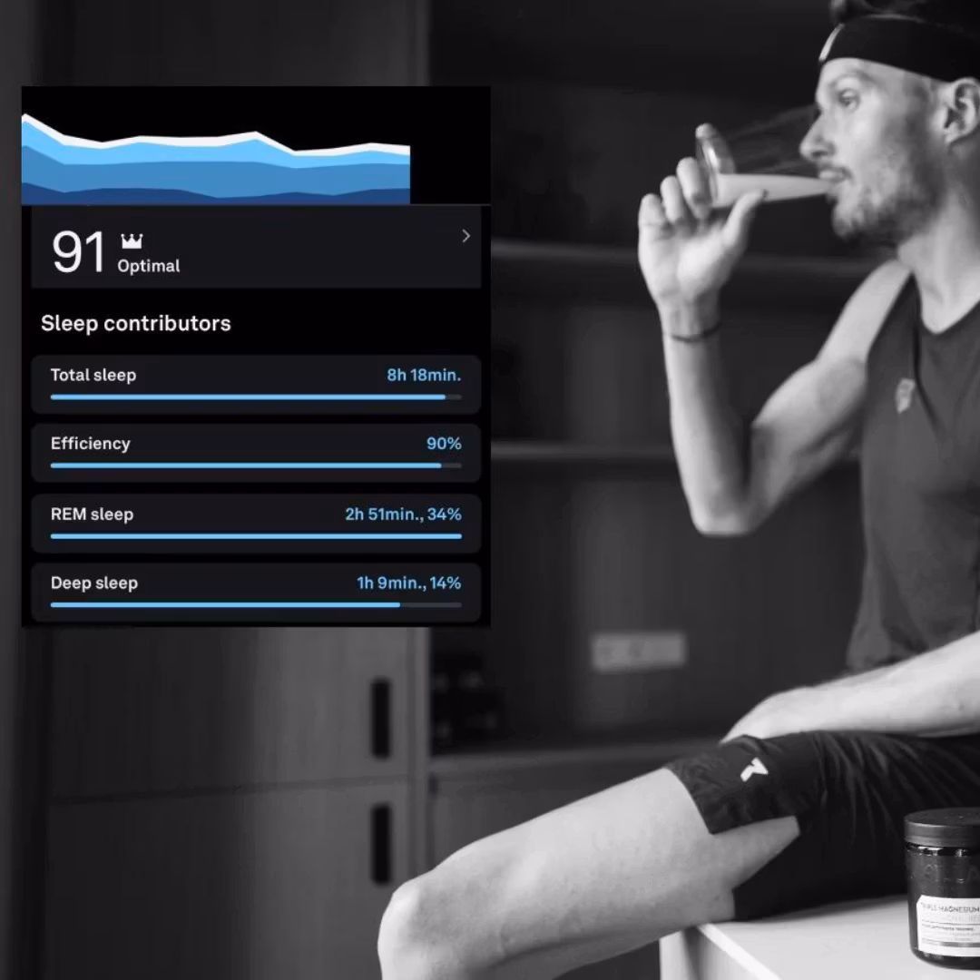 Används av bl.a. CANYON//SRAM, Israel Premier Tech, och NN Running Team (Kipchoge, Kamworor, Yehualaw). Trippel magnesium är konstruerad för prestanda. Det stöder djupare sömn, högre HRV och bättre återhämtning över natten – och det är mätbar på bärbara enheter som WHOOP, Garmin och Oura.