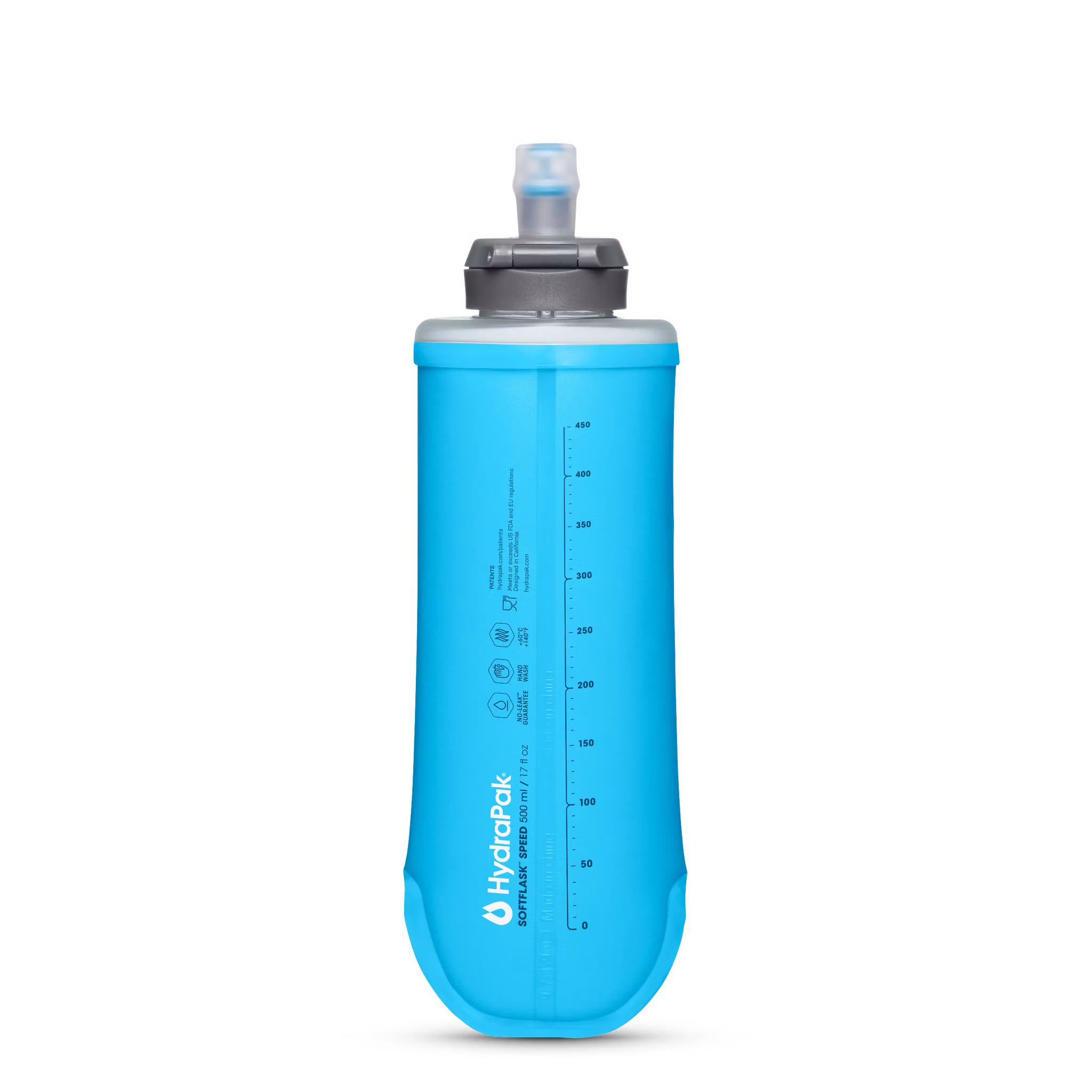 The SoftFlask Speed is specifically designed to be compatible with the widest range of vests and packs. Replacement or upgrade, the pinch-welded bottom makes loading into pockets a cinch. Its secure, single-handed SpeedFill flip top makes filling fast — both water and fuels — and the self-sealing silicone bite valve delivers sips, not drips. And all this weighs just grams.